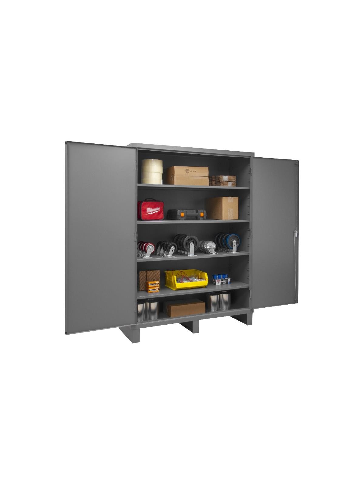 Industrial duty, all welded 16-gauge steel with 3-point locking system with keyed handle and lock rods, 4 keys included. Adjustable shelves rest on louvered panels and adjust on 4" centers. No tools required for installation. H2505 & H2506 models have 6"H base/legs which provide access for forklifts, pre-punched holes allow for lagging to the floor. (Constructed of 3/16" steel) Gray, textured powder coat finish. FOB Shipping Point.