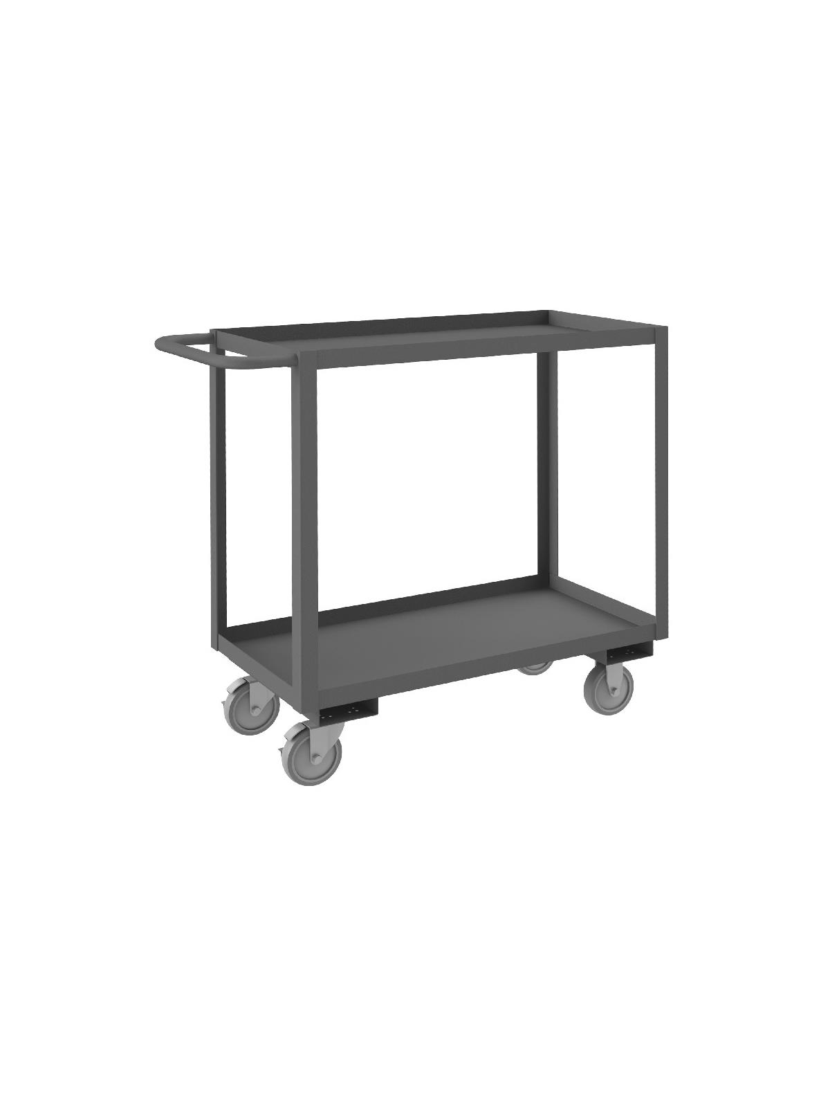 Shelf carts are constructed with 1-1/2" x 1/8" angle iron uprights for added strength. Heavy duty 14 gauge steel shelves. Sturdy tubular push handle. Perfect for transporting heavier parts or stock items. Shelf Stock Carts are available in 1,200 lbs. or 3,000 lbs. capacities. FOB Shipping Point.