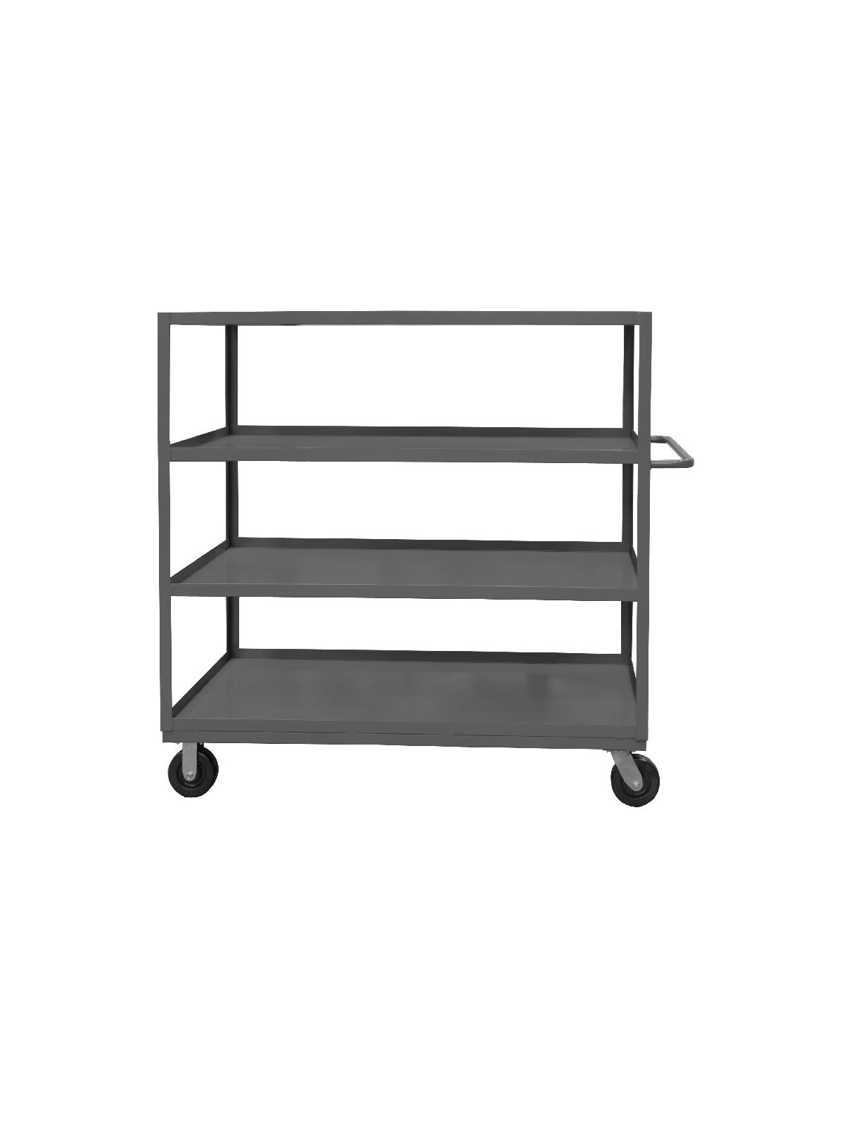 Shelf carts are constructed with 1-1/2" x 1/8" angle iron uprights for added strength. Heavy duty 14 gauge steel shelves. Sturdy tubular push handle. Perfect for transporting heavier parts or stock items. Shelf Stock Carts are available in 1,200 lbs. or 3,000 lbs. capacities. FOB Shipping Point.