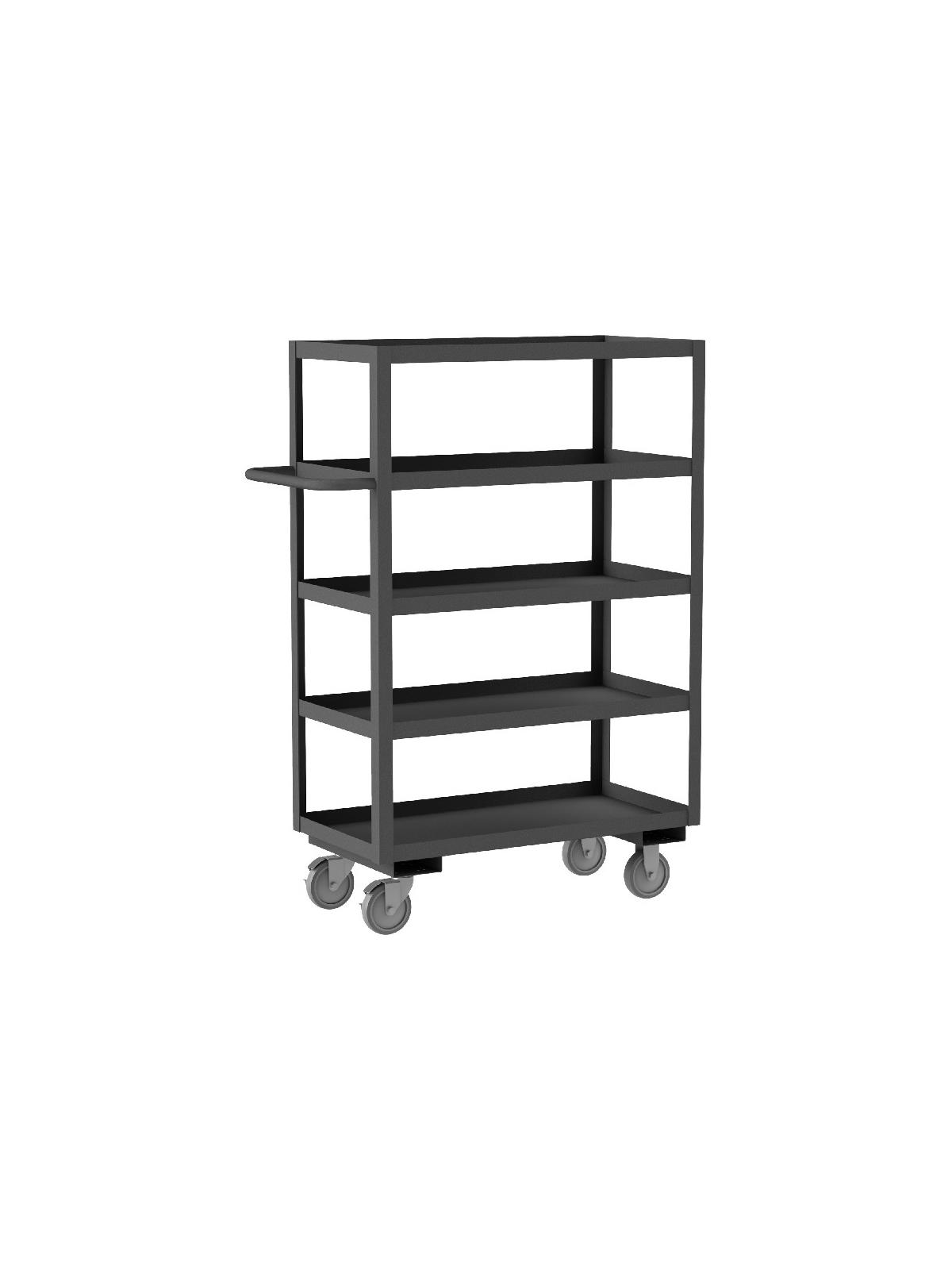 Shelf carts are constructed with 1-1/2" x 1/8" angle iron uprights for added strength. Heavy duty 14 gauge steel shelves. Sturdy tubular push handle. Perfect for transporting heavier parts or stock items. Shelf Stock Carts are available in 1,200 lbs. or 3,000 lbs. capacities. FOB Shipping Point.