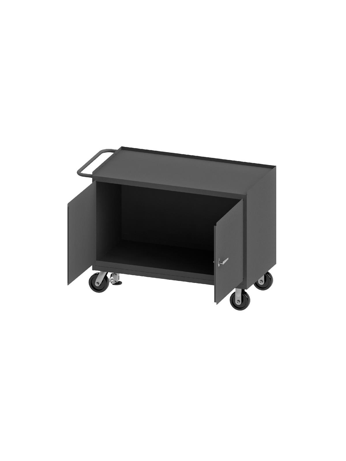 Bench cabinets are constructed of 14 gauge steel. Convenient sturdy work surface with back and end stops on the work surface prevents parts from falling off during transport (MT units not included). Tubular handle for easy maneuverability. Cabinet doors have a 3 point locking system with 4 keys. Rolls smoothly on 5" polyurethane bolt-on casters, (2) swivel with side brakes and (2) rigid. 36"W model has 1,200 lbs. capacity. 48"W model has 2,000 lbs. capacity and includes a floor lock to keep the unit in place while you work. FOB Shipping Point.