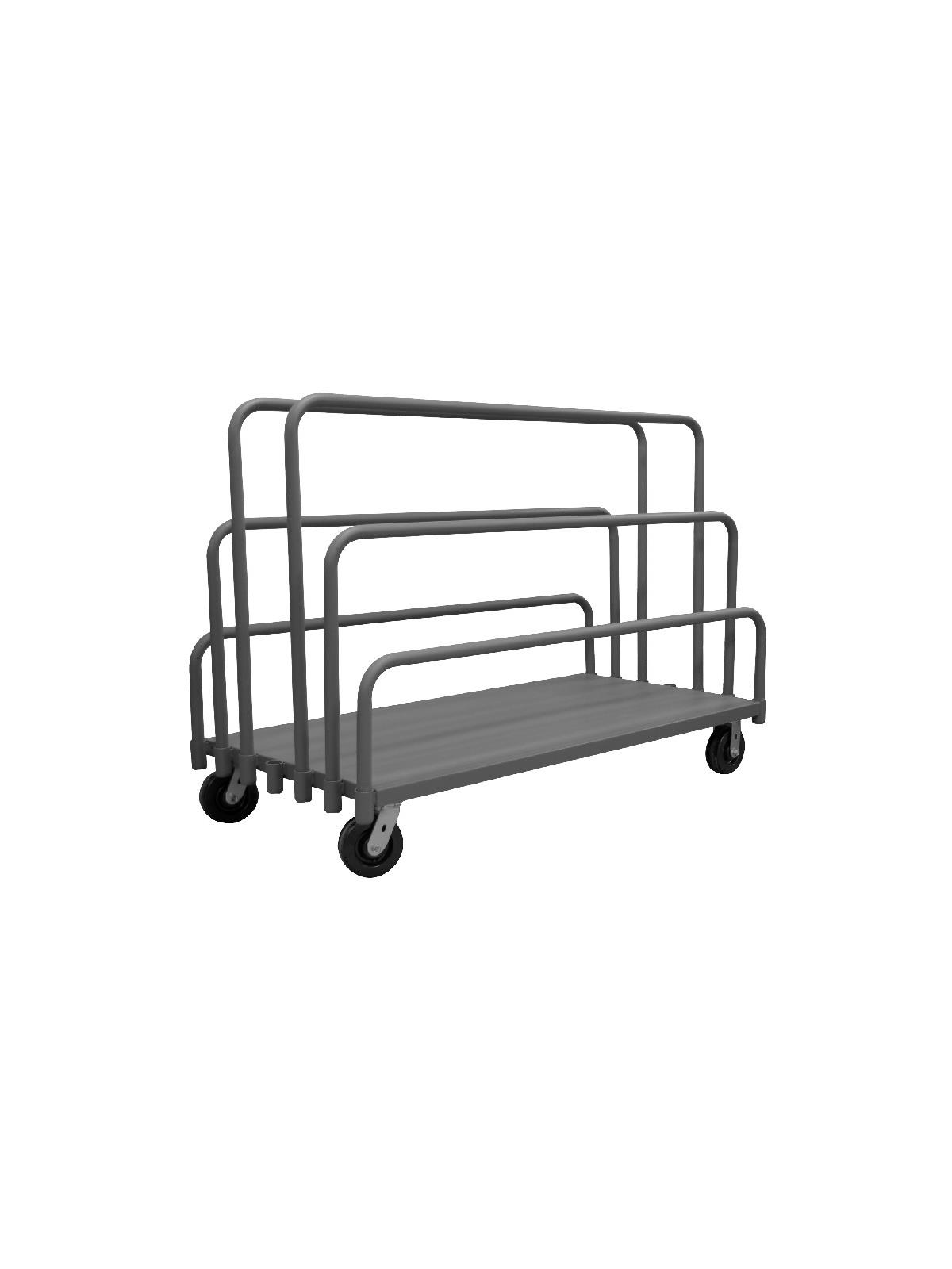 Easy to access and pick up on-board product. Create multiple opening sizes by adjusting dividers. All casters: 2 rigid, 2 swivel. Allows for the storage and transportation of various sizes of panels and product. Gray, textured, powder coat finish. FOB Shipping Point.
