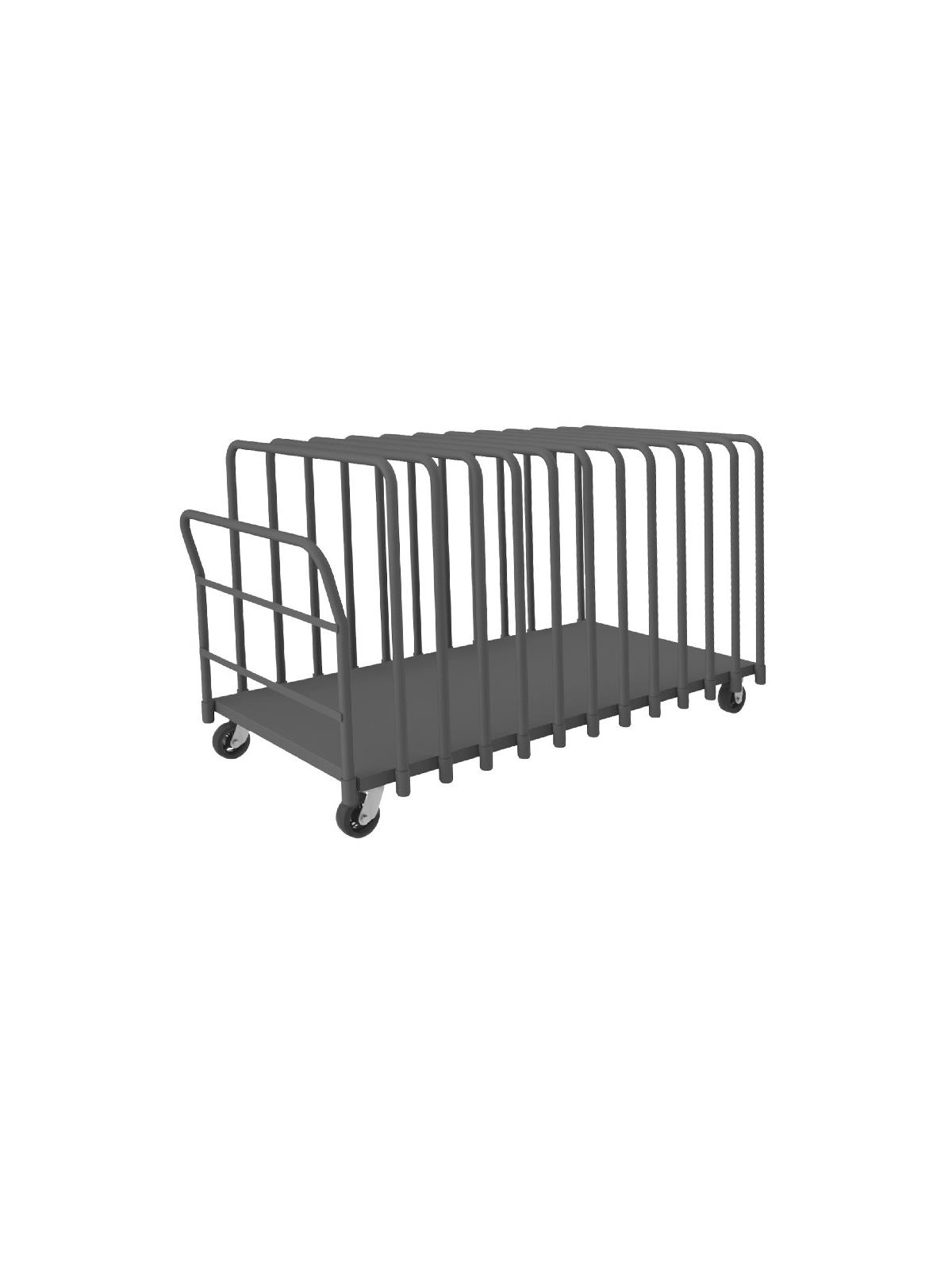 Easy to access and pick up on-board product. Create multiple opening sizes by adjusting dividers. All casters: 2 rigid, 2 swivel. Allows for the storage and transportation of various sizes of panels and product. Gray, textured, powder coat finish. FOB Shipping Point.