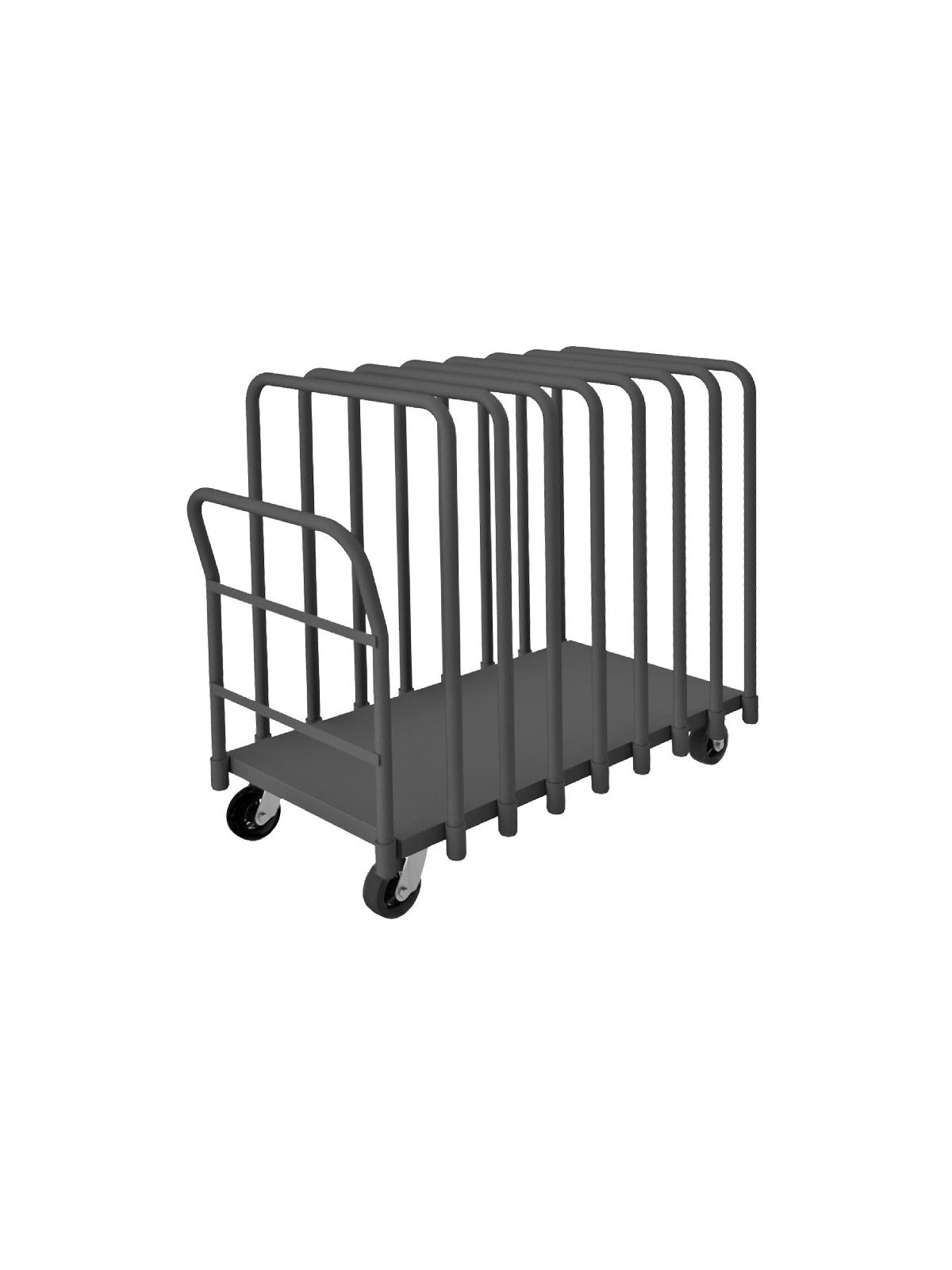 Easy to access and pick up on-board product. Create multiple opening sizes by adjusting dividers. All casters: 2 rigid, 2 swivel. Allows for the storage and transportation of various sizes of panels and product. Gray, textured, powder coat finish. FOB Shipping Point.