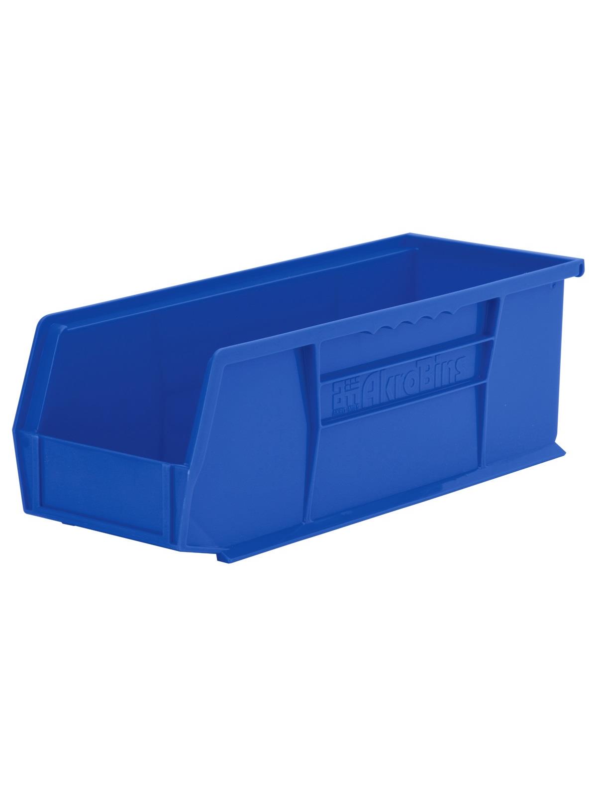 AkroBins are heavy-duty and securely stack on top of each other, sit on shelving, and hang from Akro-Mils racks, panels, rails and carts. Unaffected by weak acids and alkalis the sturdy one piece construction is water, rust and corrosion-proof. Finger grip allows for easy handling. Large label slot for easy identification of contents. Autoclavable up to 250° F. Guaranteed not to crack or break under normal load conditions as stated in the 1-year limited warranty. Optional dividers and labels available, see Related Items tab. AkroBins available in Red, Yellow, Blue, Green, Black, Stone, and Semi-Clear. FOB Shipping Point.