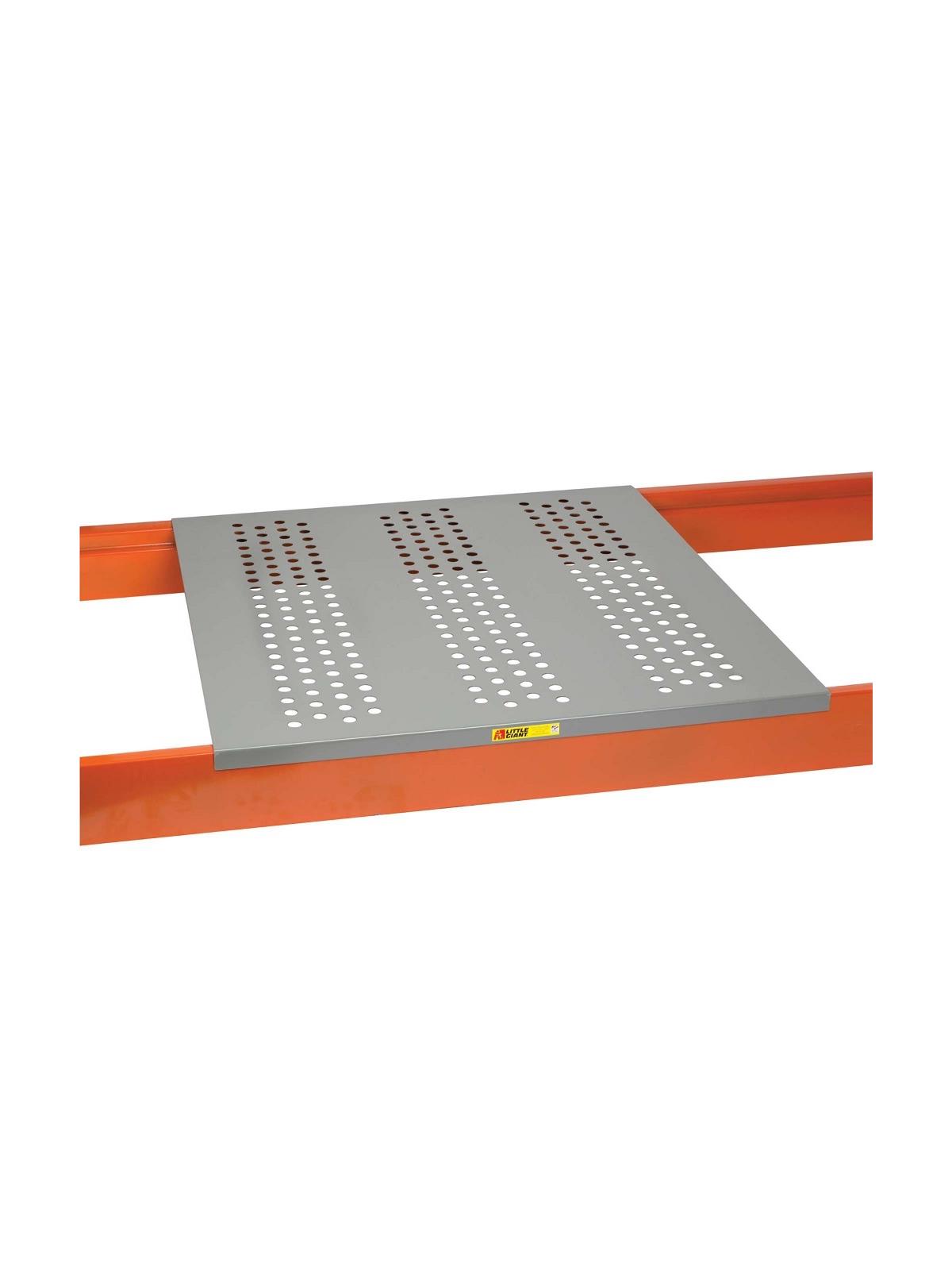 Smooth 14 gauge steel surface with durable powder coated finish. Perforated decking has 1" diameter holes. 12 gauge reinforced channels on underside fit 1-5/8" step beams. 1-1/2" waterfall on front and back edges. Each decking section has a load capacity of 3,000 lbs. FOB Shipping Point.
