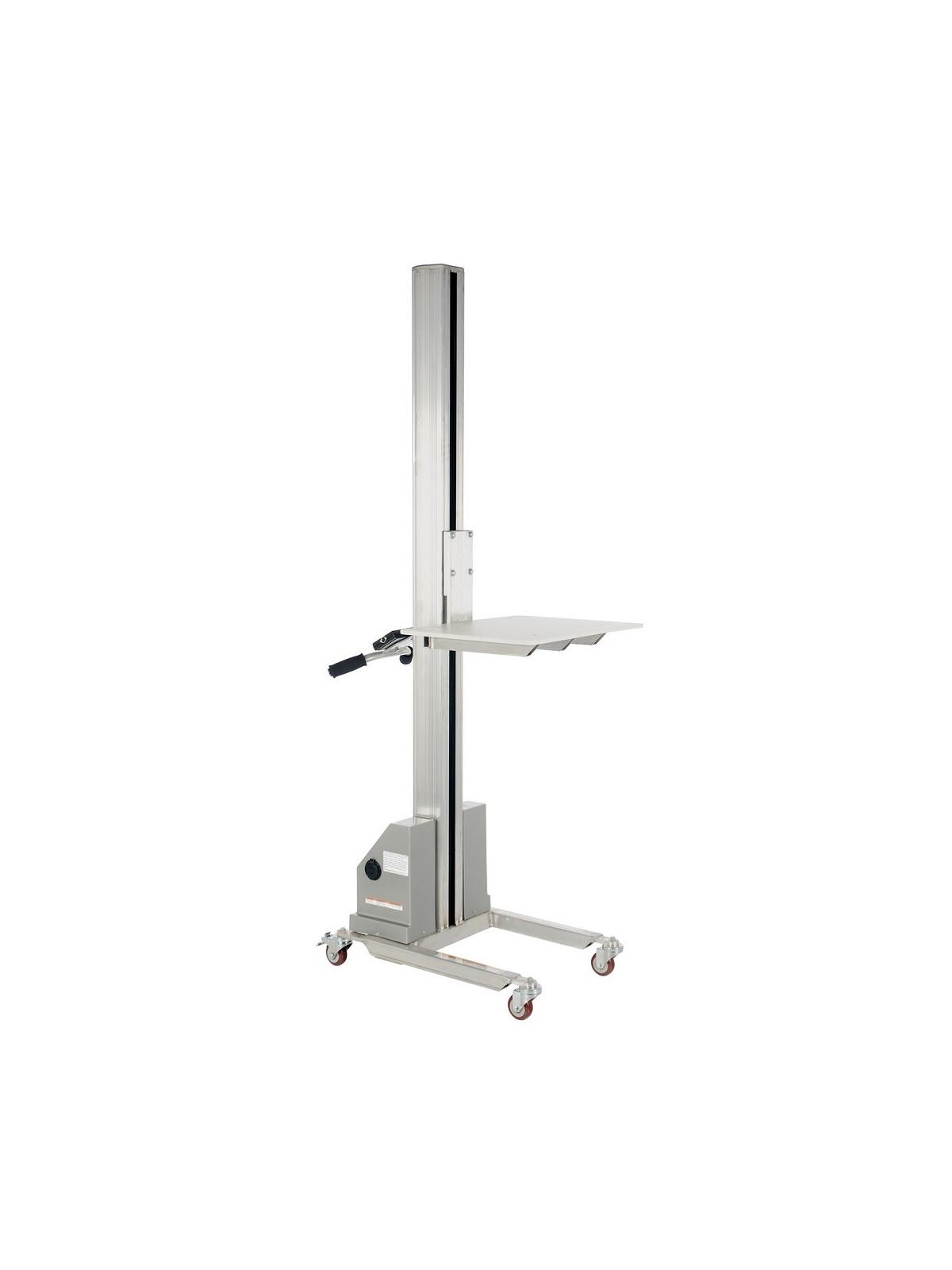 All lift components concealed in lift column -- no dangerous pinch points. Ideal for clean room environments. Virtually maintenance free design. Finger tip lift speed adjustment. Rolls on 3" x 1-1/2" polyurethane wheels -- 2 swivel/lock, 2 swivel. Standard with push button control panel, 115V AC charger. Optional hand held push button control available. FOB Shipping Point.