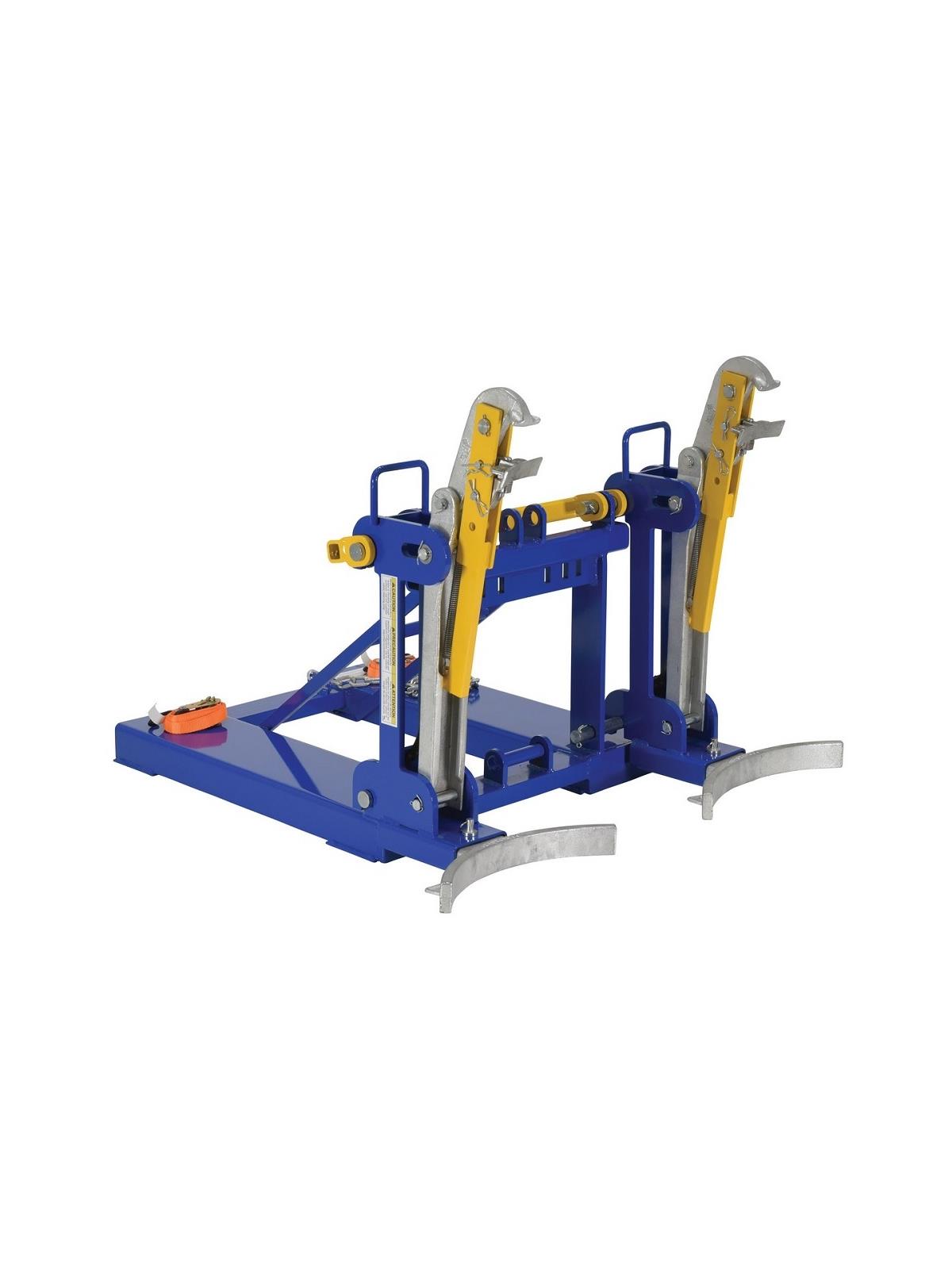 This time tested and proven design allows a fork truck operator to easily secure, move and release drums without leaving the seat of the fork truck. For use with open and closed head plastic, steel and fiber drums with a top lip strong enough to support the weight of the drum. Choose single drum or double drum configuration. Works with 30 and 55 gallon drums. All-welded sturdy construction. Low maintenance design. Includes safety chain to secure unit to carriage of fork truck. Powder coat blue finish. Fork pockets 7-1/2"W x 2-1/2"H usable. FOB Shipping Point.