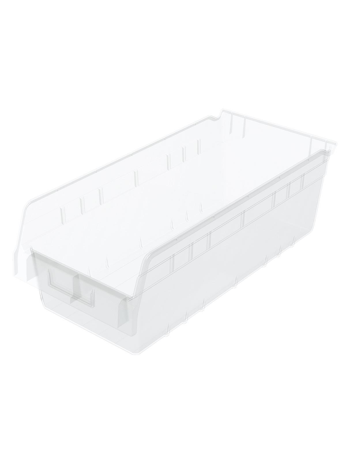 Clear 6" ShelfMax® Bins expand storage capacity up to 85% over standard 4" bins. Rolled top edge for added strength when filled to capacity. Durable clear polypropylene construction. Optional lids and dividers available. FOB Shipping Point.