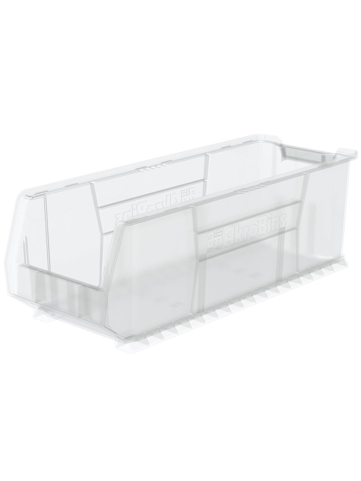 20", 24" and 30" Deep Clear Bins for Super-Size Storage. Large capacity storage bins for organizing heavy or bulky items. Heavy-duty bins molded in clear polypropylene. Extra large stacking containers feature anti-slide stop to prevent bins from shifting forward. Reinforced side ribs add strength and prevent spreading when stacked or loaded. Optional lids and dividers available. FOB Shipping Point.
