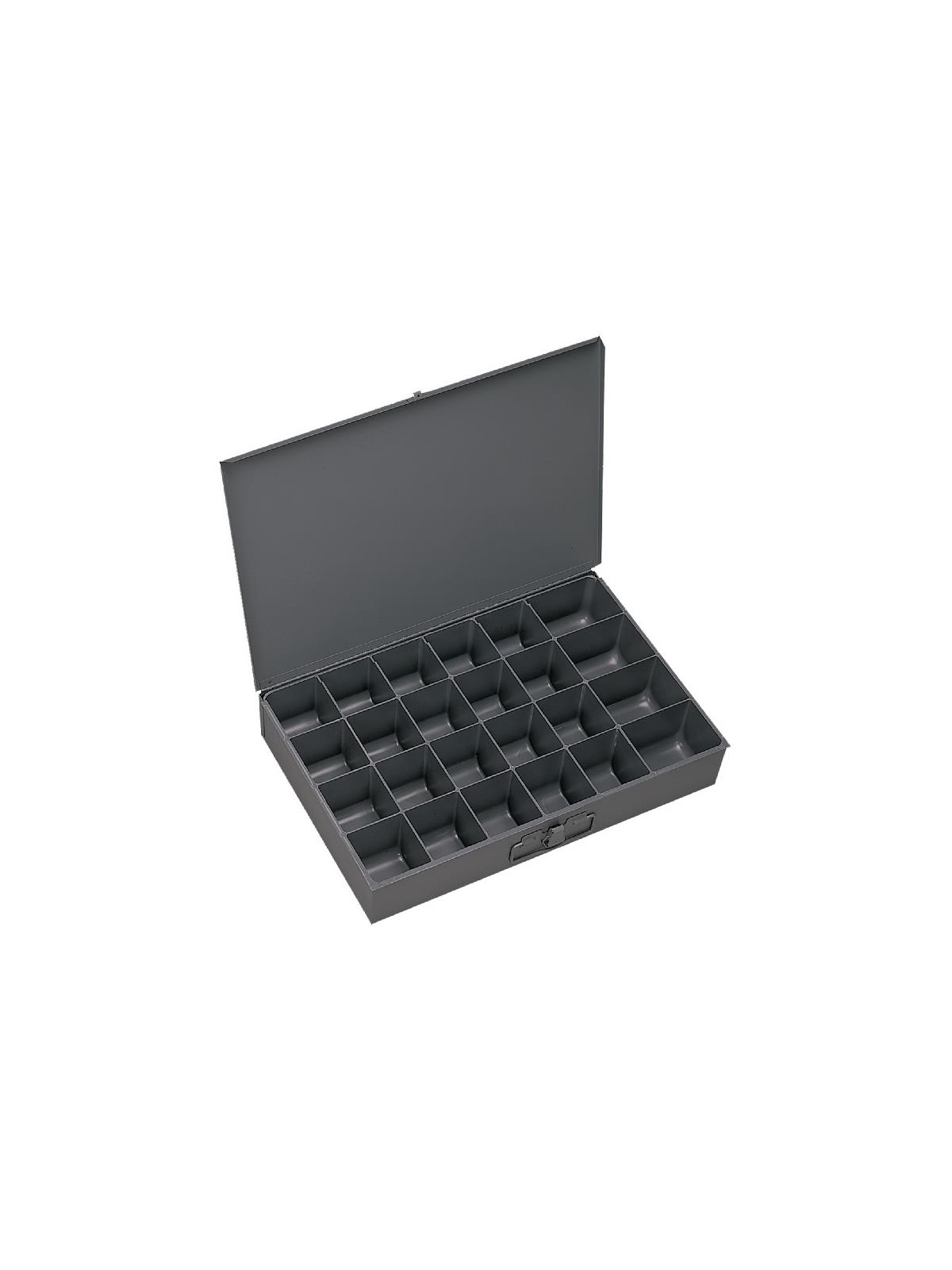 Efficient storage and organization for a variety of parts and components. Each compartment box interior is manufactured of polypropylene with scooped bottoms, both front and back for easy parts removal. Rugged steel, all-welded cabinets are reinforced for rigidity. Use on the workbench, counter or carry to the job site with convenient thumb-grip handles. Finished in acid and rust resistant Gray powder coating. FOB Shipping Point.