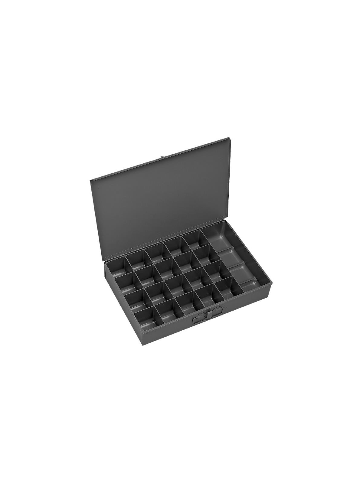 Efficient storage and organization for a variety of parts and components. Each compartment box interior is manufactured of polypropylene with scooped bottoms, both front and back for easy parts removal. Rugged steel, all-welded cabinets are reinforced for rigidity. Use on the workbench, counter or carry to the job site with convenient thumb-grip handles. Finished in acid and rust resistant Gray powder coating. FOB Shipping Point.