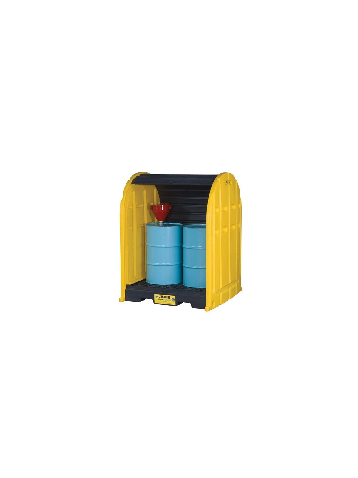 These weather resident outdoor DrumSheds™ offer you high performance spill control and help reduce landfills by using recycled products. Features convenient roll top doors allowing access from front or rear. Forklift pockets front and back make it easy to relocate empty sheds. The EPA/SPCC compliant leak proof pallet sump features thick, durable deck grating which removes for easy inspection and clean up of spills. A spacious interior offers ample head space to accommodate working operations with funnels or pumps. Safety features include grounding capability and integral anchor bolt locations for wind resistance. Molded in lugs accept padlocks for security. Ships fully assembled to save on set-up time. Optional ramp simplifies drum placement. Exceeds EPA, SPCC, NFPA1, and the Int'l Fire Code. FOB Shipping Point.