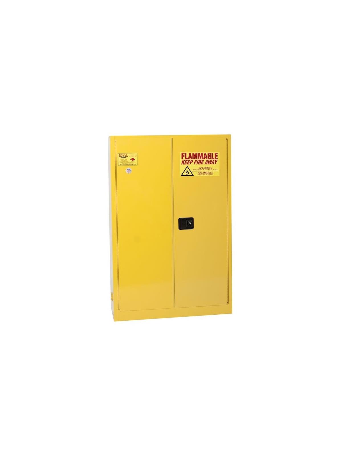 Eagle flammable storage cabinets come in yellow high gloss powder finish with red warning, grounding attachment, 3-point key lock, and 2-inch raised leakproof door sill. Each shelf is adjustable, supported by four brackets, and can support 350 pounds. All our metal cabinets meet NFPA Code 30 and OSHA requirements. Flammable cabinets help keep flammable liquids near work areas safely. Constructed of 18-gauge steel, all cabinets feature reinforced double-wall construction with air space on the sides, top, bottom, back and doors. Flammable cabinets, also known as fire cabinets, come in standard design, tower cabinets with legs, wall mounted cabinets, under counter cabinets, and add-on cabinets. FOB Shipping Point.