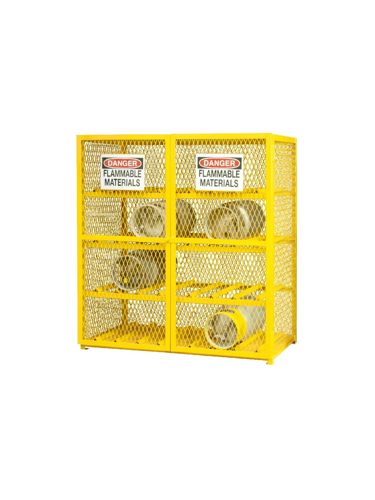 Lockable cabinets store cylinders of fuel, LP gases and other flammable materials on easy-to-access cylinder cradles. "DANGER FLAMMABLE MATERIALS" signs on each door. Magnetic catch keeps doors safely shut when not locked. Heavy-duty butt hinges keep doors from sagging. Includes padlock hasp to secure contents - padlock not furnished. Made of sturdy 1-1/2" x 1/8" angle iron frame. Pre-drilled holes for lagging to floor. Durable, rust and acid resistant safety Yellow powder coat finish. When used properly, units are in full compliance with OSHA and NFPA standards. FOB Shipping Point.