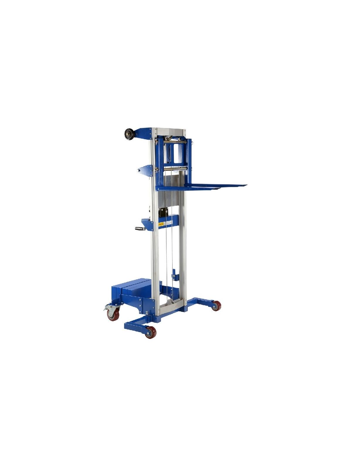Operated by a hand-crank winch that features a reversible handle and a hold-down device for securing the carriage during transport. Forks can be inverted to provide 2 different heights. Rugged thick steel forks are 4"W x 1-3/4" thick and forks measure 20-1/2"W x 22"L overall. Truck is made of durable steel-and-aluminum. Two 8" non-marking rear wheels, two 2" front swivel casters. Counter balanced design has poly-on-poly wheels, (2) 5" rear swivel wheels, (2) 4" front wheels. Models ending with 'HP' and 'EHP' suffixes have extended height capabilities. These units have a 2 stage mast system and a telescoping inner mast frame, giving the user the ability to extend the forks above the height of the first mast. FOB Shipping Point.