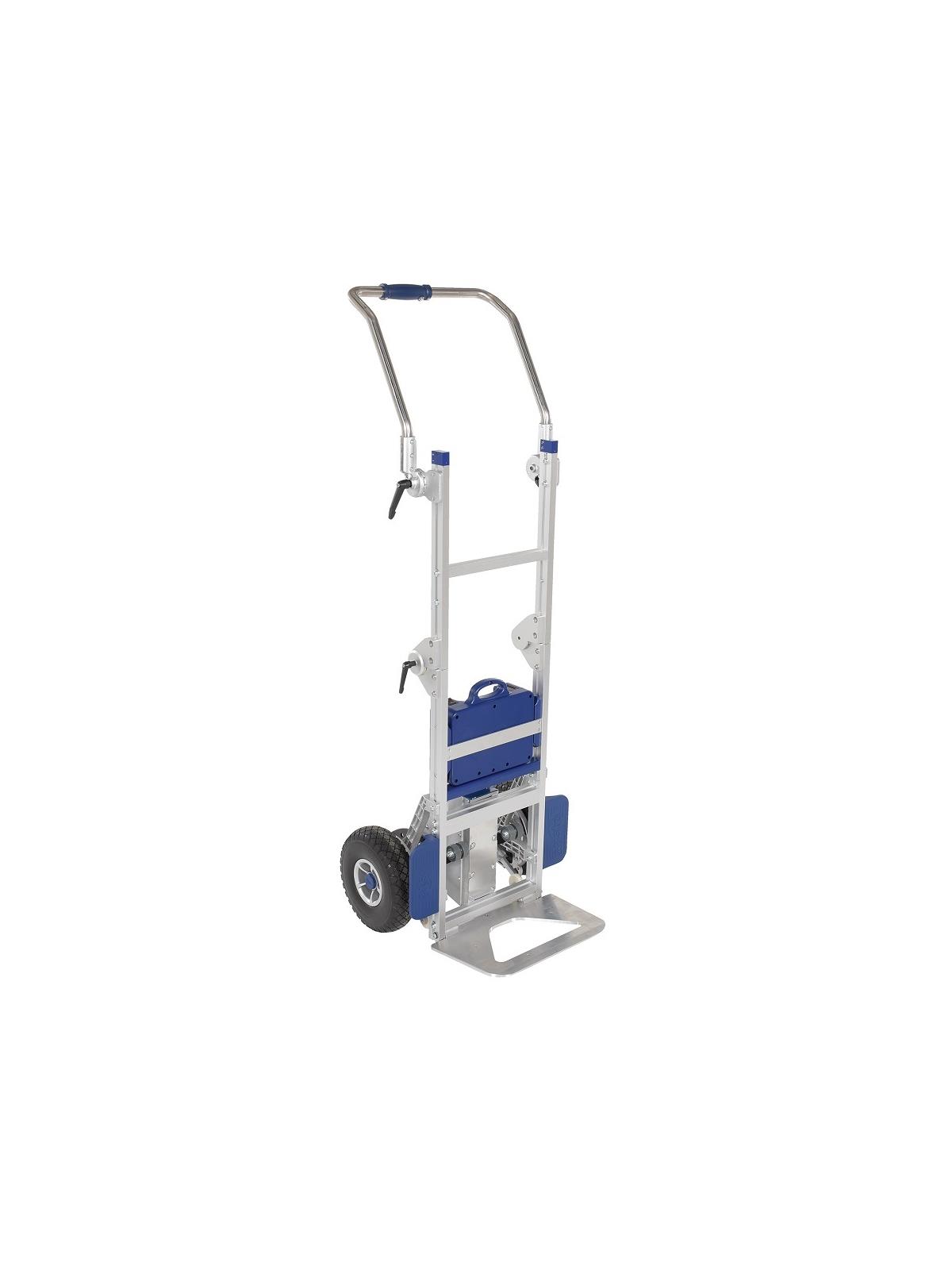J) Powered Stair Climber...Powered Stair Climber powered with electric lifting/lowering system is ideal to transport light to medium duty and awkward loads up and down stairs. Ideal for copiers, copy paper, filing cabinets, furniture and appliances. Stair climber handles the load up/down stairs and the operator only balances the load. Combined powered stair climber and hand truck that is light weight but lifts load 10 times more than its own weight. Brake activates automatically when going down stairs. Ergo handle with easily accessible raise/lower switch. Folds down to approximately 31". Equipped with maintenance-free 48V/8.8 Ah light weight, high quality and easy to replace Lithium-ion battery. Built-in battery charger indicator. Durable aluminum alloy construction.
