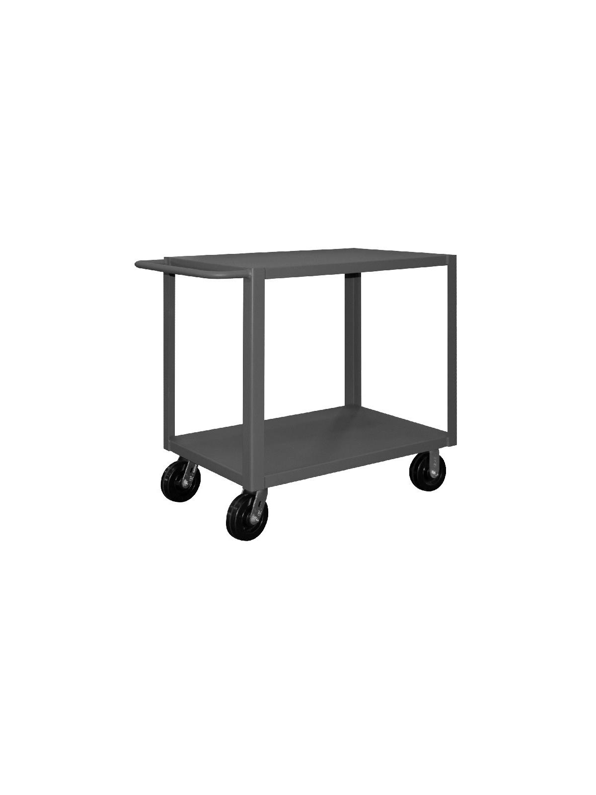 Heavy Duty Portable Tables have a 2" x 3/16" angle iron frame for added strength. Shelves are reinforced and have lips down. (2) swivel and (2) rigid bolt-on casters. Sturdy tubular push handle for easy maneuverability. 4,000 lbs. capacity unit has welded 14 gauge steel shelves with channel formed sides. 5,000 lbs. capacity unit has welded 12 gauge steel shelves. FOB Shipping Point.