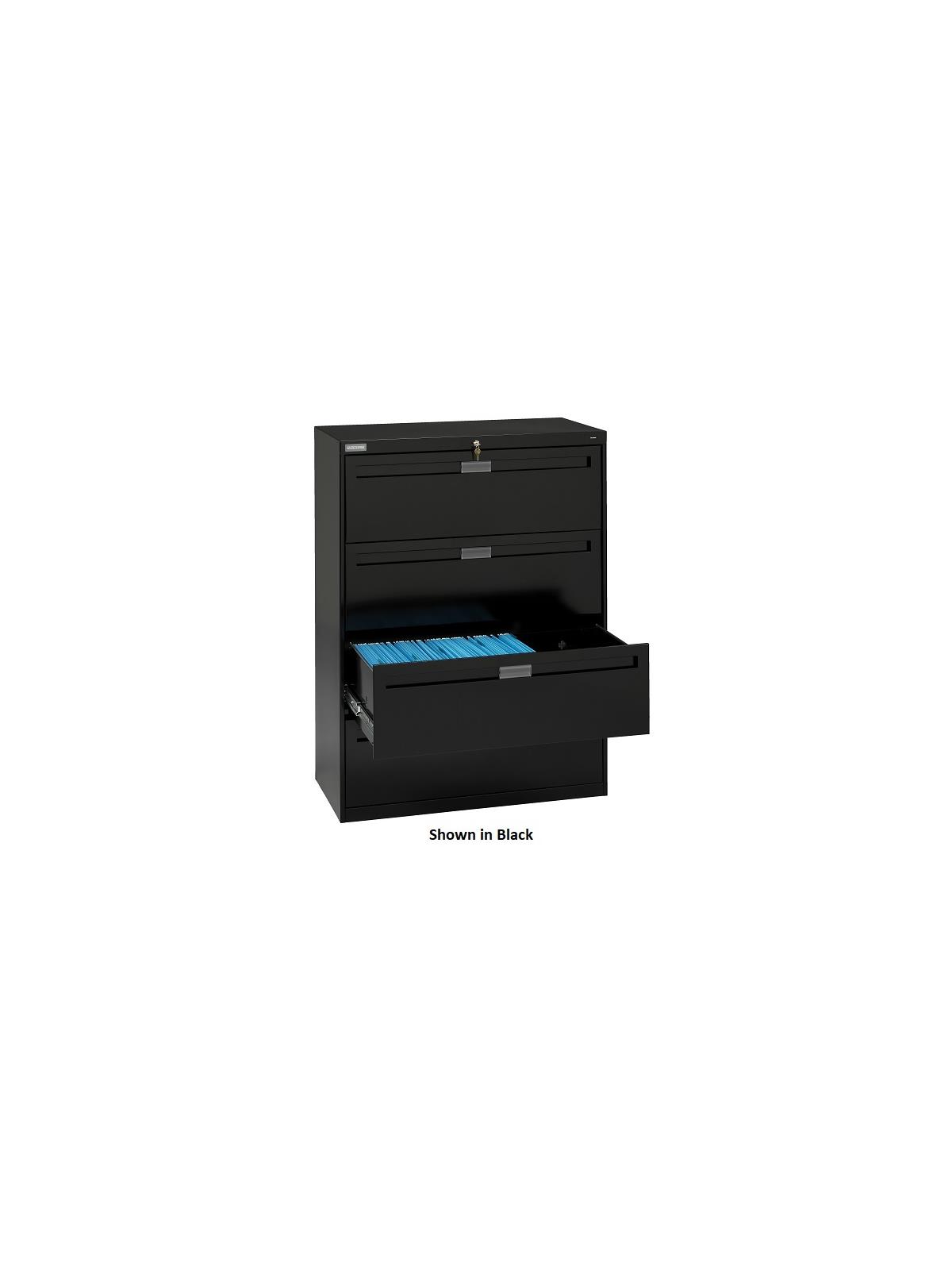 Drawers and doors have easy grip, full-width pulls with recessed label holders. Four leveling glides allow the unit to be leveled on uneven floors. To reduce risk of tipping, order two drawer lateral files with counterweights (suffix "W") for all applications except under a work surface in a workstation. Five and six-high units have retractable door(s) with roll-out drawer on top opening(s). Durable powder-coat paint finish. Available in Light Gray, Medium Gray, Putty, Sand and Black. FOB Shipping Point.