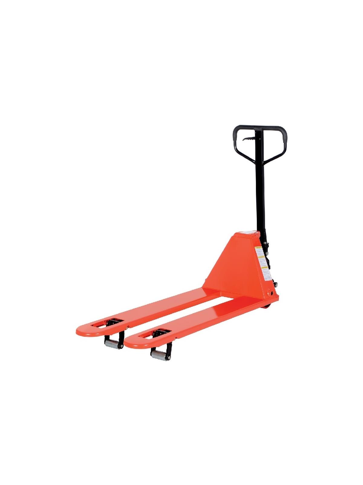 Steering wheels include precision bearing and dust covers for added life. Nose wheels are located on the front edge of each fork to assist in clean pallet entrance and exit. 2 entry wheels facilitate easy entry and 2 exit rollers make disengagement much smoother. Reinforced triple-formed forks. Internally mounted solid steel adjustable push rods. Spring loaded loop handle automatically returns to vertical position when not in use. Hydraulic pump design facilitates easy-access seal replacement. Chrome plated hydraulic pump piston for long seal life. Red baked-in powder-coated toughness. FOB Shipping Point.