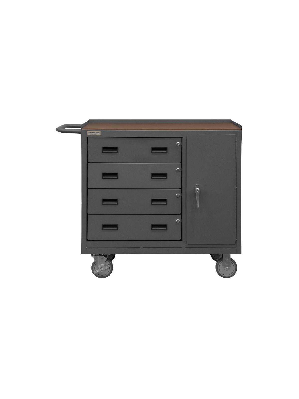 Unit features back and end stops on the work surface. Bolt-on 5 x 1-1/4" polyurethane casters, 2 swivel and 2 rigid with side brakes. Cabinet compartment comes equipped with one adjustable shelf and a keyed handle with 3 point locking system. Models with -TH in the part number include a work surface with 1/4" thick tempered hardboard. Drawers measure 20-7/16" W x 14-11/16" D x 5-7/8" H. Ships fully assembled and ready to use. FOB Shipping Point.