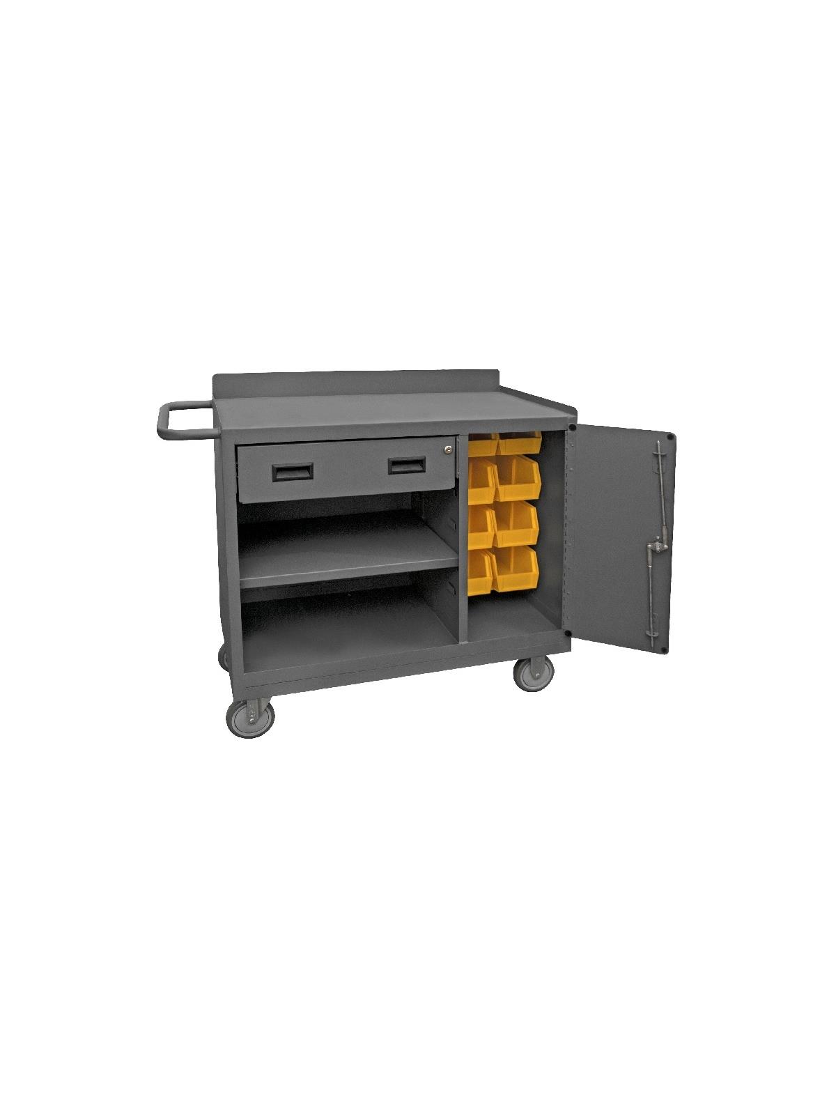 Unit features back and end stops on the work surface. Bolt-on 5 x 1-1/4" polyurethane casters, 2 swivel and 2 rigid with side brakes. Cabinet compartment comes equipped with one adjustable shelf and a keyed handle with 3 point locking system. Models with -TH in the part number include a work surface with 1/4" thick tempered hardboard. Drawers measure 20-7/16" W x 14-11/16" D x 5-7/8" H. Ships fully assembled and ready to use. FOB Shipping Point.