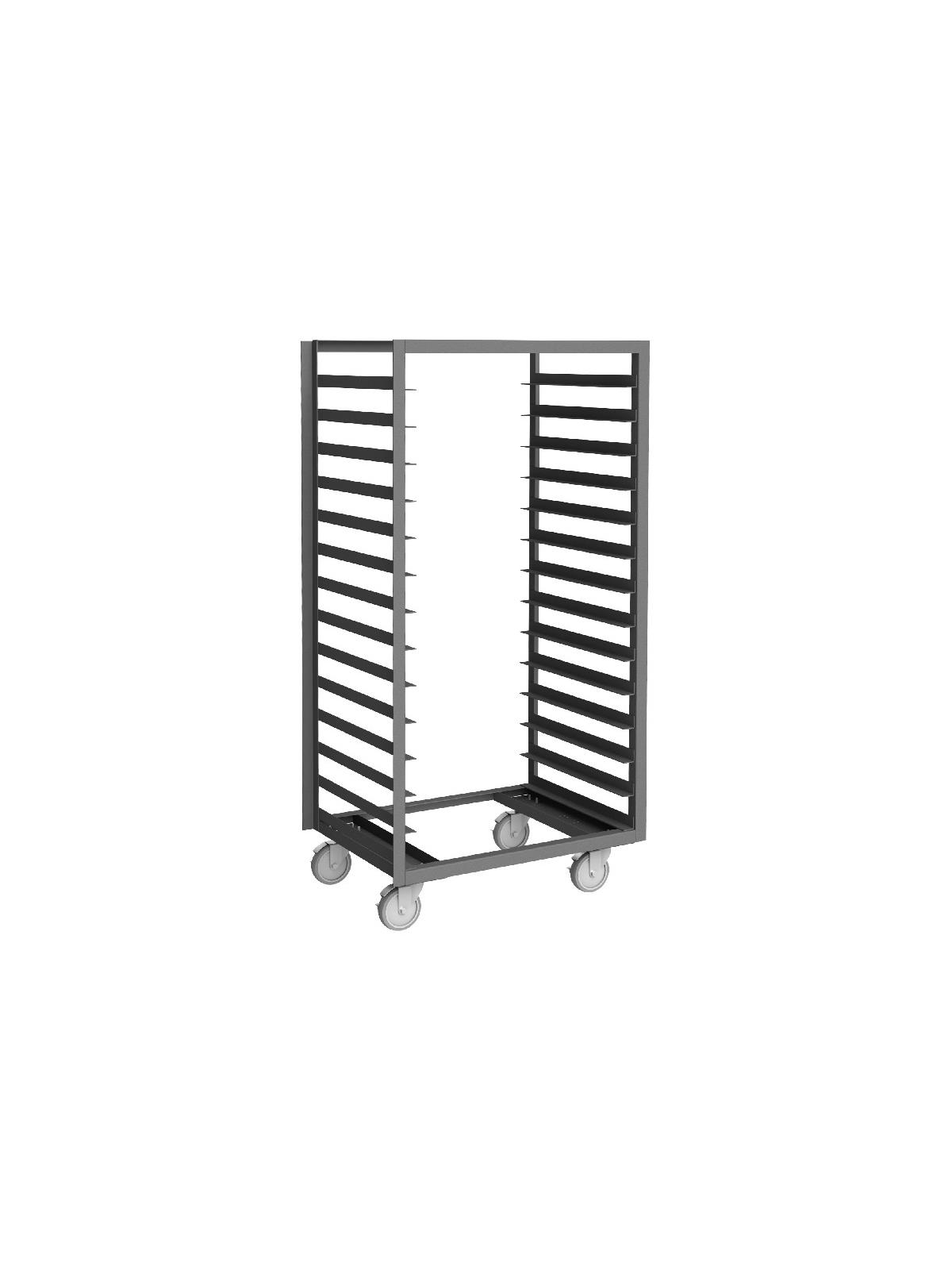 Constructed of 1-1/2" x 1/8" angle iron. Rolls of 5" x 1-1/4" bolt-on polyurethane casters, (4) swivel with side brakes. Trucks ship fully assembled. Trays slide easily into place. Durable, gray, textured powder coat finish. FOB Shipping Point.