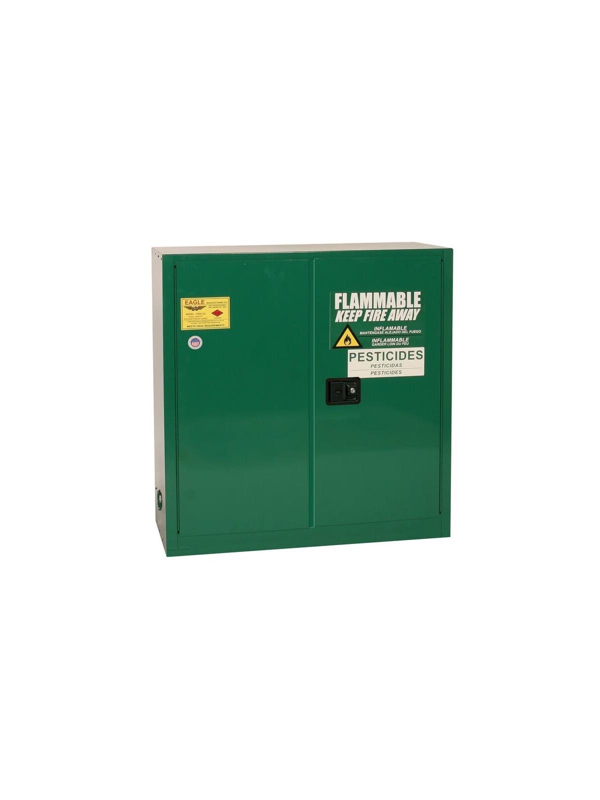 Eagle safety pesticide cabinets provide needed security for companies specializing in lawn care, golf course management, agricultural interests, and individuals who handle and store pesticides and poisons. The pesticide safety cabinets are constructed of 18-gauge steel and feature reinforced double-wall construction with air space on sides, top, bottom, back, and doors. The cabinets are coated with a lead-free, high gloss, baked-on powder finish for superior protection against chemical corrosion with large FLAMMABLE- KEEP FIRE AWAY and pesticide labels. All of our durable pesticide cabinets are FM-Approved and meet NFPA Code 30 and OSHA requirements. FOB Shipping Point.