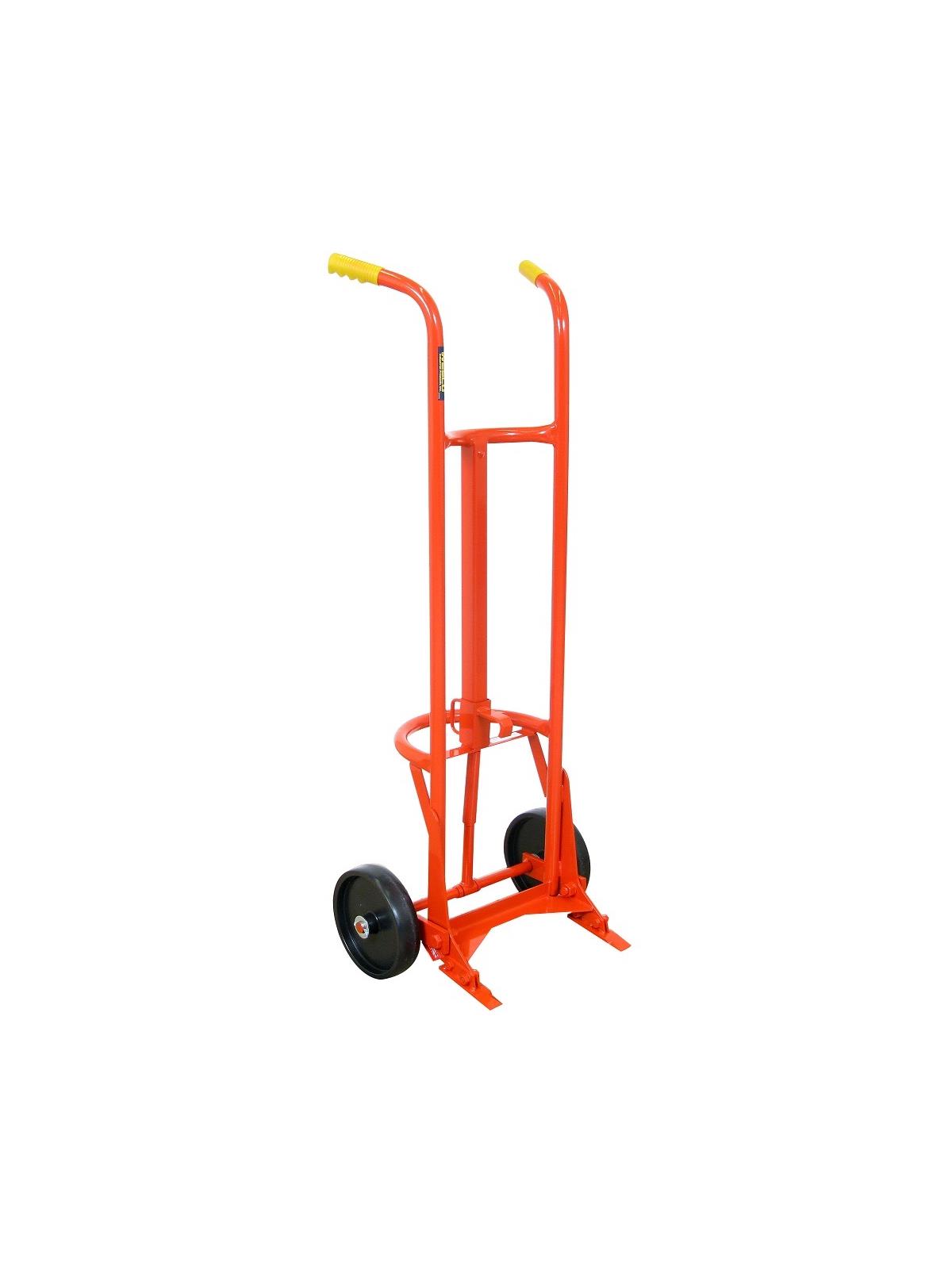 Machined steel load wheels behind nose prong help ease the lifting of drum. Classic single bar frame design. Kickstand. 24"W. at handle. 16.25"W. at nose.
